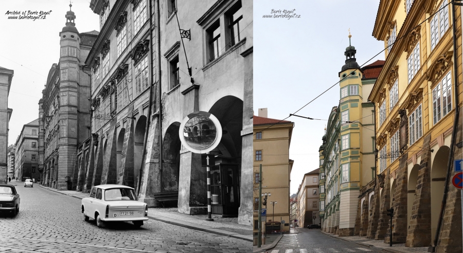Всё та же Малостранская площадь, нижняя её часть, северная сторона. На фотографиях 1965 и 2020 годов справа возвышаются дворцы Смиржицких и Штернбергов.